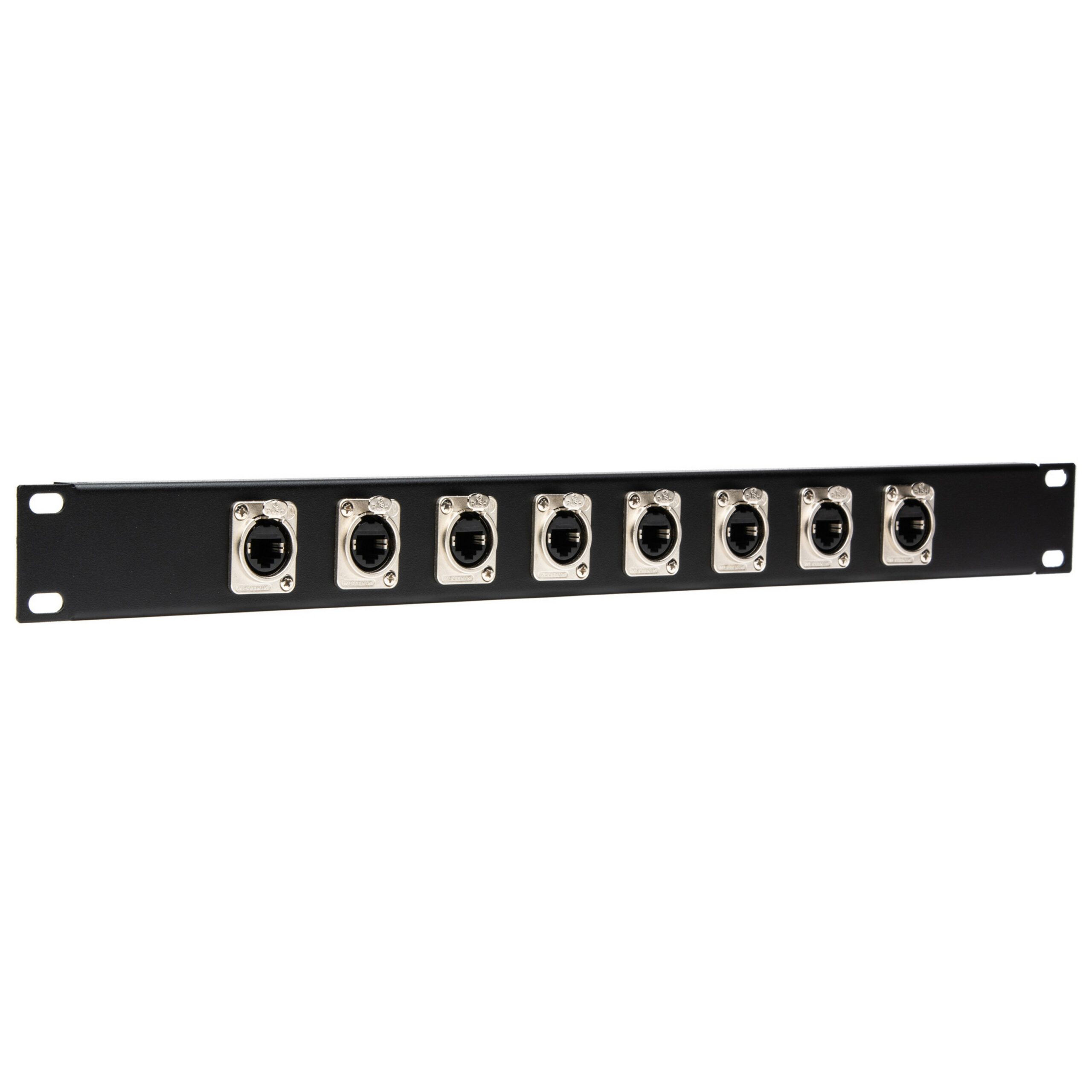 Patch panel featuring 8 Neutrik NE8FDP female RJ45 to RJ45 etherCON connectors. Mounted on 16 gauge rack mount panel. The Neutrik etherCON Series is a ruggedized and lockable RJ45 connector system, optimized for pro audio, video and lightning network applications. The chassis connectors are shaped to fit into standardized panels out of the entertainment industry. The D-Series offers the most rugged design of the etherCON series and is perfectly suitable for panel mount and the installer market.